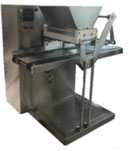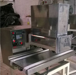 Maquina giratoria masmelera con tolva caliente y fría. Fabricada en acero inoxidable y materiales atoficos velocidad variable, porta boquillas intercambiable para variedad de productos, alta productividad, desarmable para fácil limpieza. Masmelos 1500 kilos diarios, Voltaje 220 trifásica, bandeja de 45 x 70